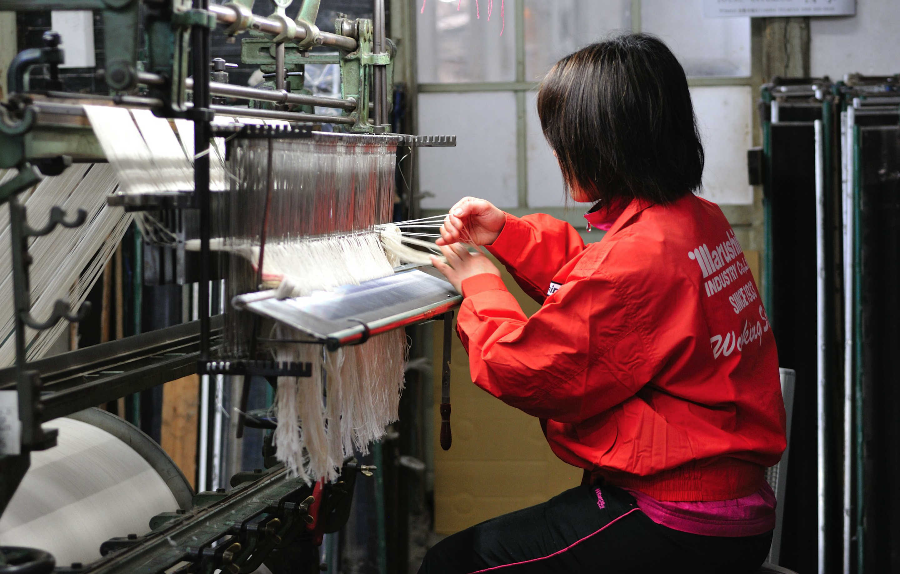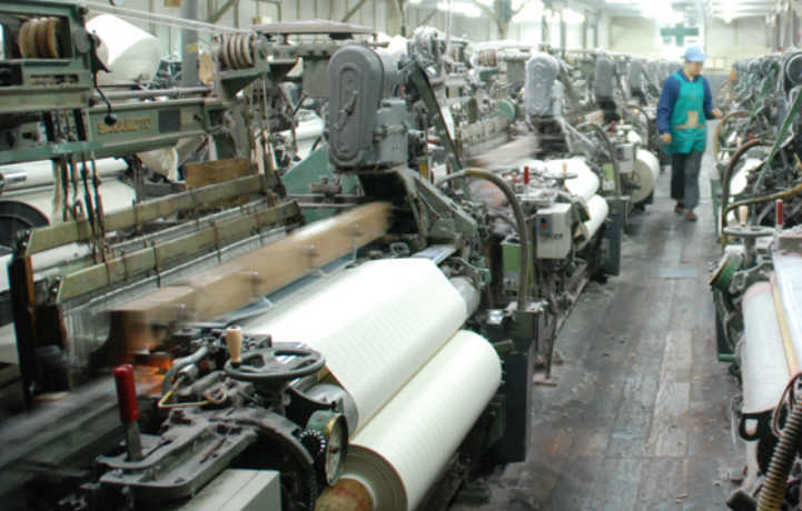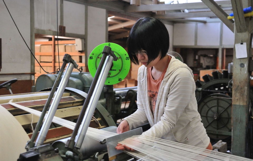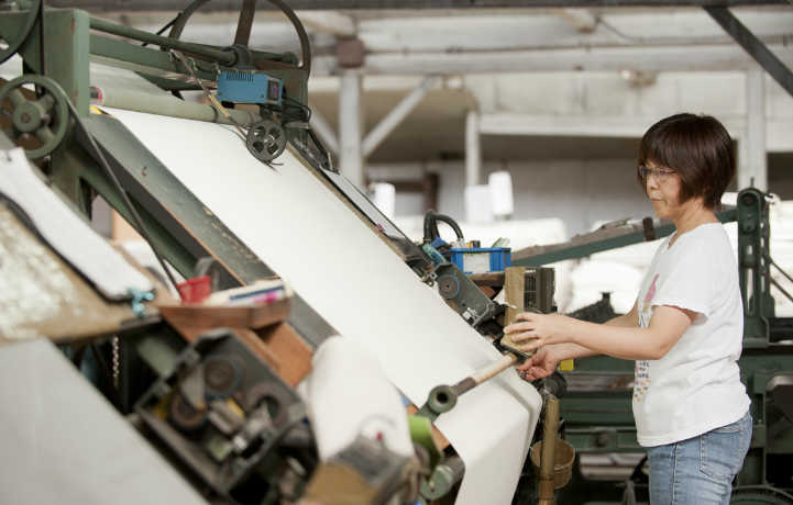 織機にビームを載せヨコ糸をセットして平織りします。1台の織機で織り上げられるのは、1日8時間で50~70mほどです。