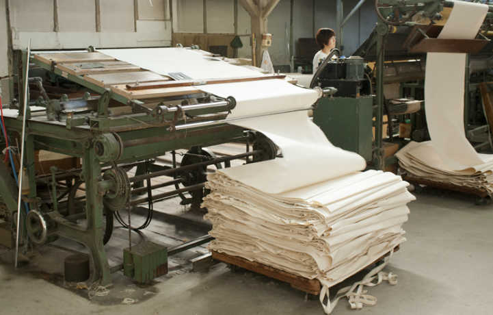 織り上がった帆布を50mごとにカットし、検反機にかけてキズや汚れなどを細かくチェックしていきます。