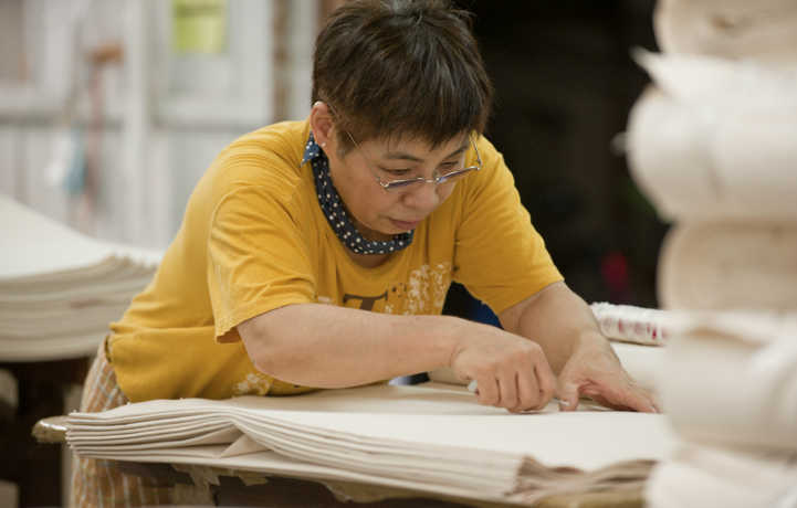 流し検反でチェックしたキズを熟練の職人が再確認、補修を施し最後にハケで糸くずなどを払い落として完成。