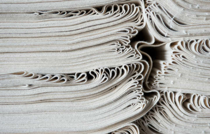 1m毎に重ねて畳み、さらに二つ折りにし号数毎に積み上げます。この形が豆腐に似ているのでトウフタタミとも呼ばれます。